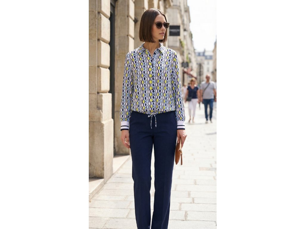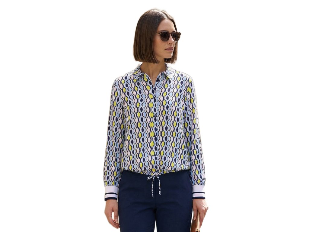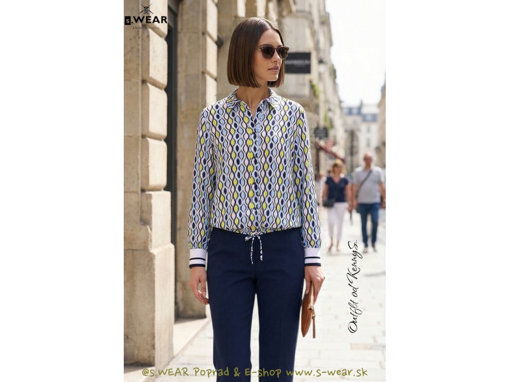Elegantná dámska košeľa s moderným geometrickým vzorom v kombinácii modrej, bielej a limetkovo žltej farby. Ľahký, splývavý materiál zabezpečuje pohodlie počas celého dňa a dodáva outfitu svieži, sofistikovaný vzhľad.