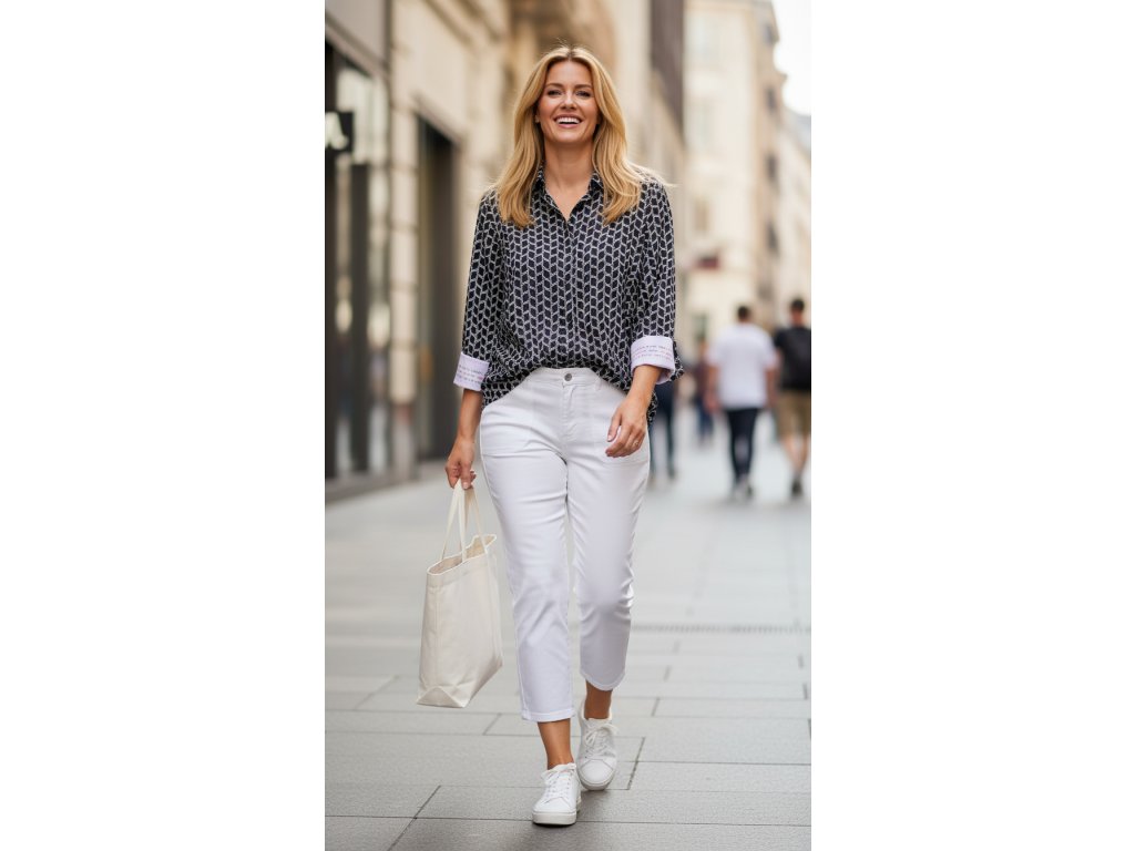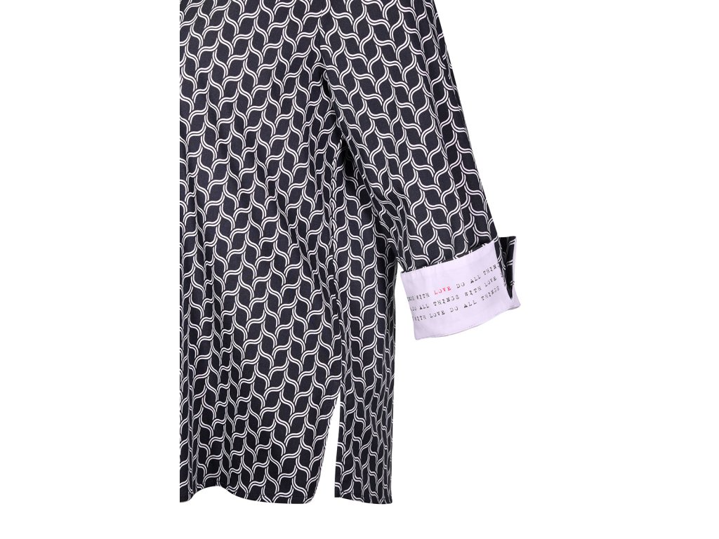 Rafinované detaily, ktoré si zamilujete Na prvý pohľad zaujme klasickým košeľovým golierom a elegantnou gombíkovou légou po celej dĺžke. To pravé čaro sa však skrýva v rukávoch. Moderná 7/8 dĺžka s malým rozparkom pôsobí vzdušne a odľahčene. Keď manžety vyhrniete, odhalíte vnútornú stranu s potlačou "wording" – inšpiratívnym nápisom, ktorý dodá vášmu dňu pozitívnu energiu. Dizajn dopĺňa dekoratívna páska v zadnej časti pri krku a rovný spodný lem s bočnými rozparkami, vďaka čomu košeľa krásne splýva cez boky a netlačí.
