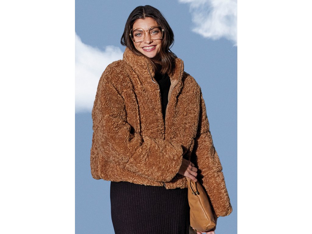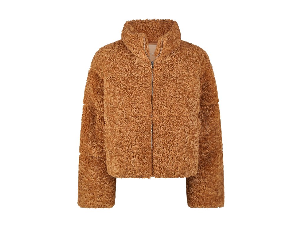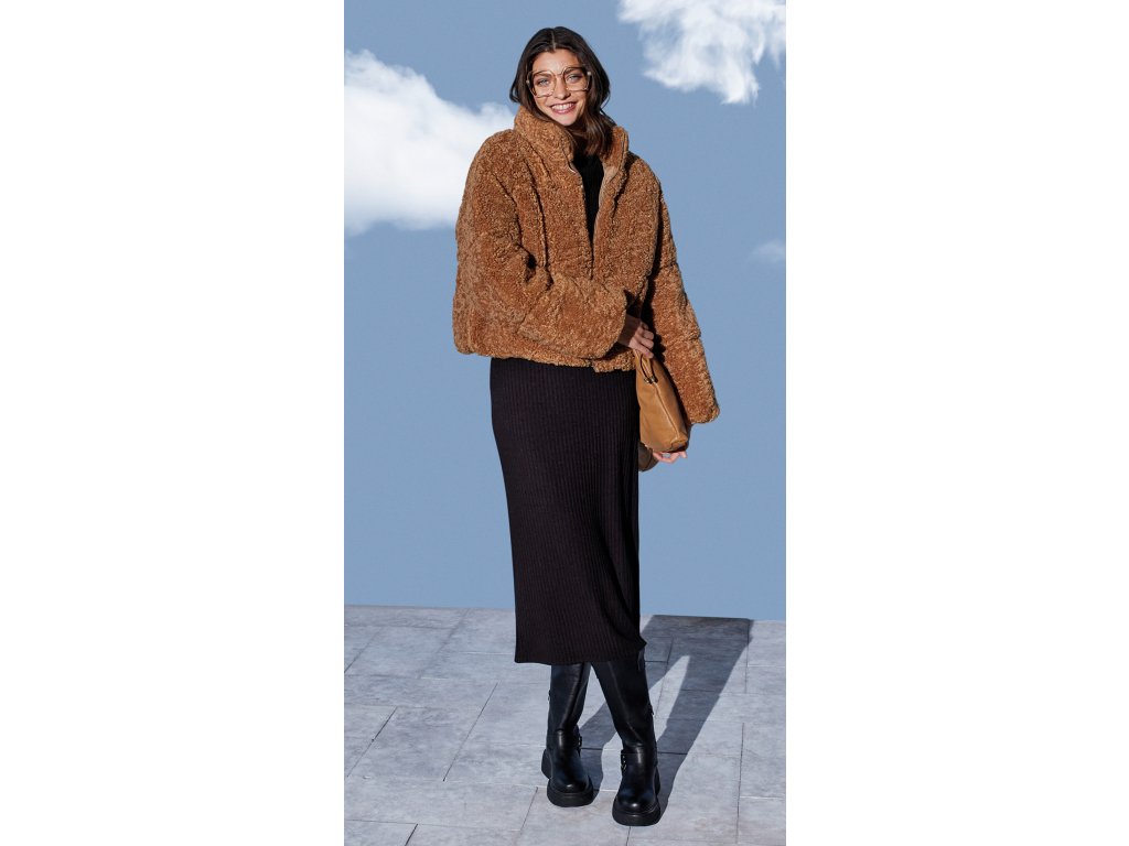 Dámska hnedá kožušinová bunda v štýle „teddy“. Má krátky, voľnejší strih a je vyrobená z mäkkého a huňatého materiálu, ktorý pripomína plyš alebo ovčiu vlnu. Farebne ide o teplý karamelovo-hnedý odtieň, ktorý pôsobí útulne a trendy. Tento typ bundy je ideálny na chladnejšie jesenné a zimné dni, kombinuje komfort, štýl a ležérnu eleganciu.