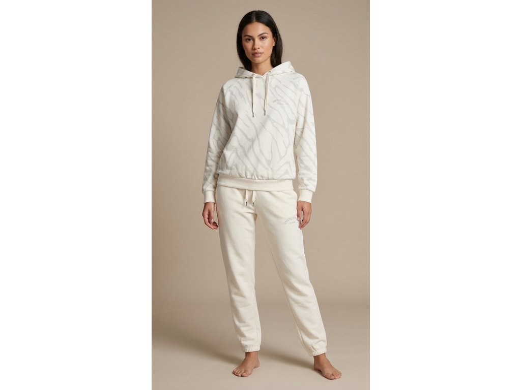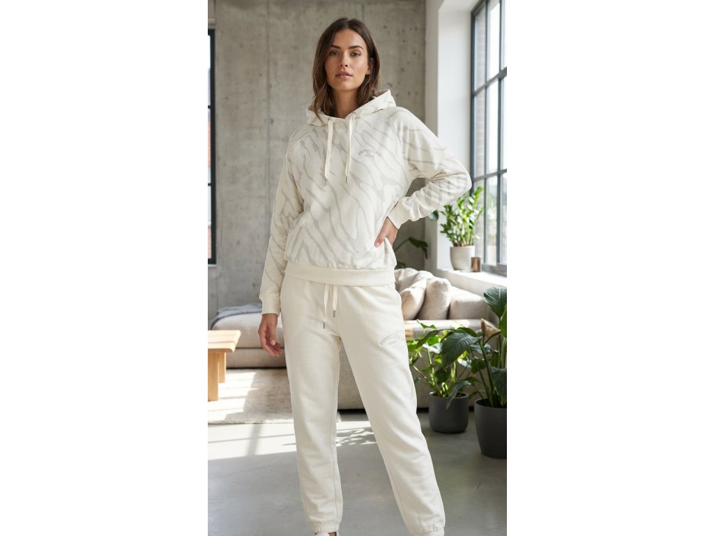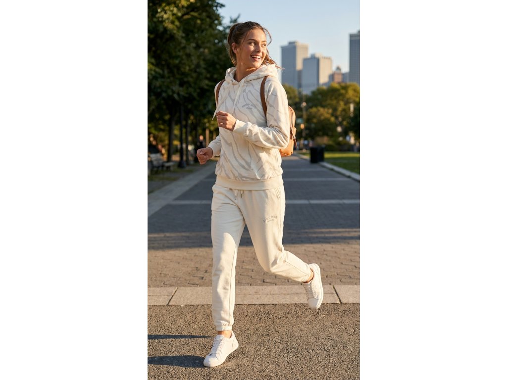 Moderný lounge outfit, ktorý spája jemnú s uvoľneným mestským vibe. Mikina v svetlom odtieni s cloud grey s decentným grafickým printom pôsobí čisto a nadčasovo, zatiaľ čo zladené tepláky vytvárajú harmonický a premyslený celok.