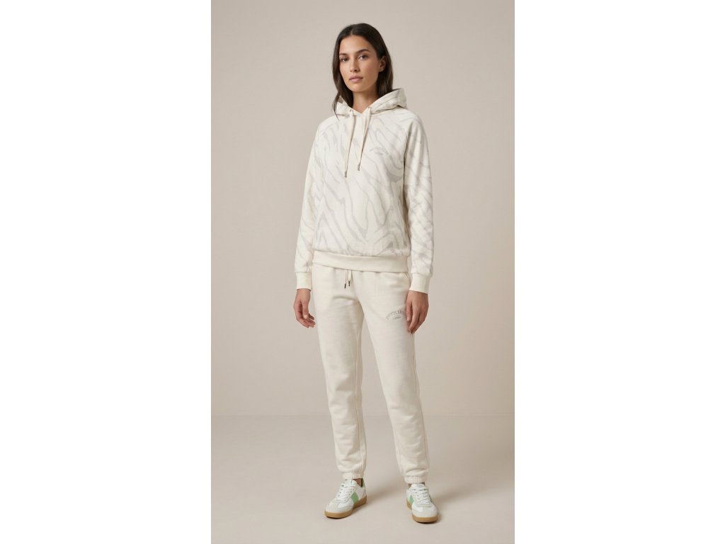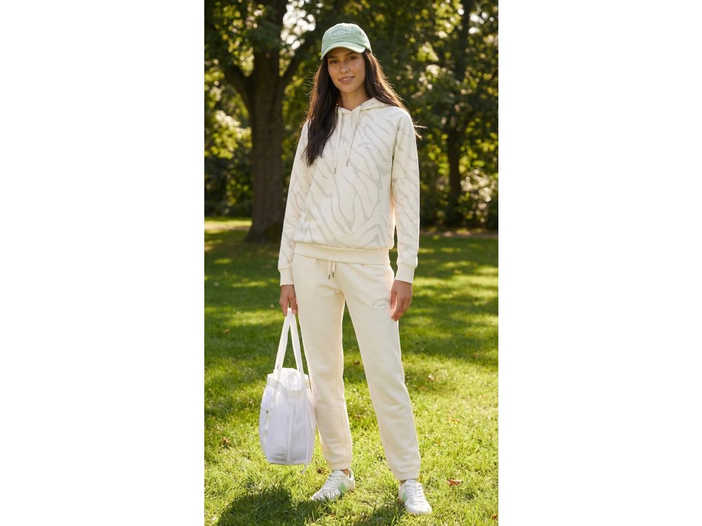 Mikina má pohodlný strih s kapucňou a jemným vzorom, ktorý dodáva outfitu originalitu bez toho, aby pôsobil rušivo. Tepláky v rovnakom farebnom tóne majú elastický pás so sťahovaním a zúžené nohavice zakončené manžetami, vďaka čomu krásne sedia a držia tvar.
