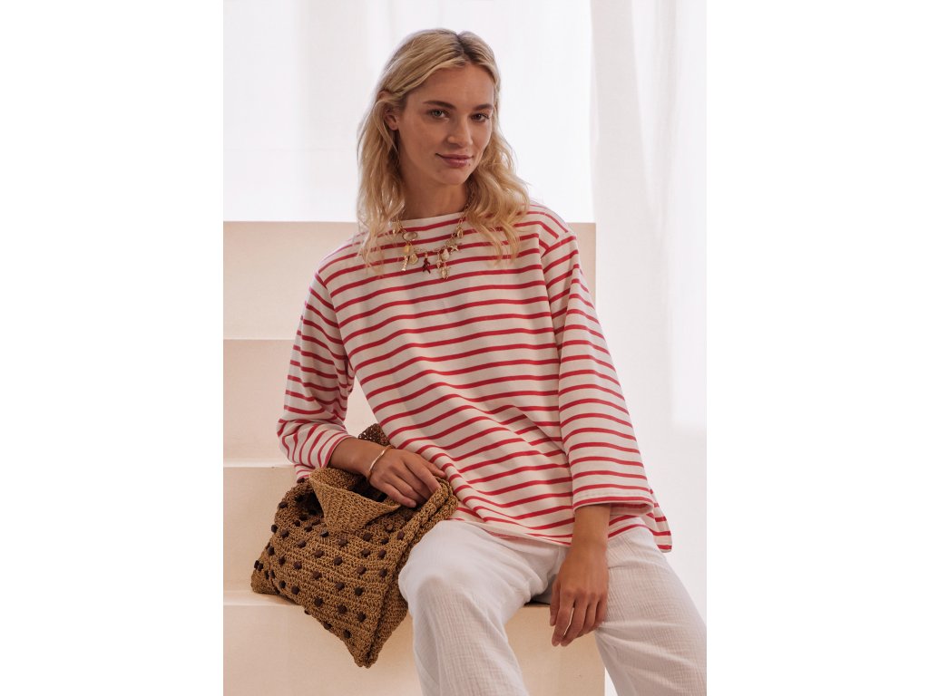 Strih a dizajn, ktorý lichotí postave Mikina vyniká rovným, príjemne voľným strihom (relaxed fit) so zníženou líniou ramien, čo jej dodáva nenútený a veľmi aktuálny vzhľad. Elegantný širší výstrih jemne odhaľuje krk a prechádza do moderných 3/4 rukávov, ktoré mikinu vizuálne odľahčujú. Práve vďaka tejto dĺžke rukávov je model absolútne ideálnou voľbou na prechodné jarné obdobie, kedy hľadáte zlatú strednú cestu medzi svetrom a ľahkým tričkom. Nesmrteľný prúžkovaný vzor je módnou stálicou, ktorá nikdy neomrzí a okamžite dodá vášmu outfitu dovolenkový, uvoľnený vibe.