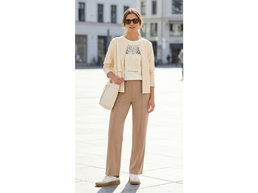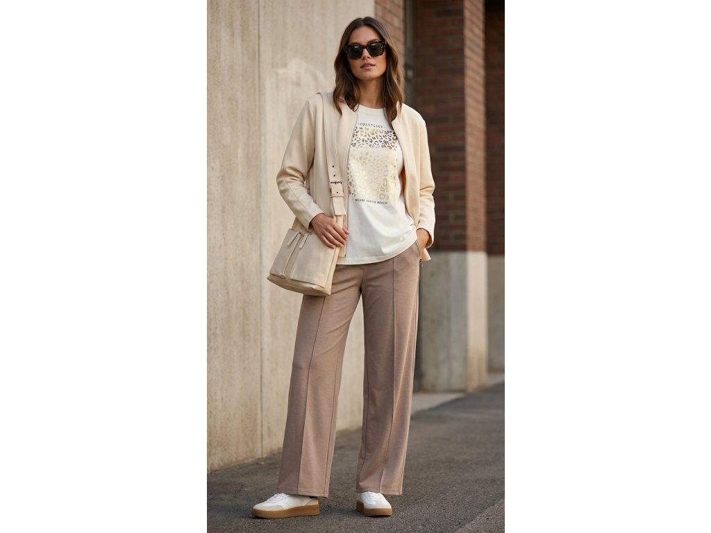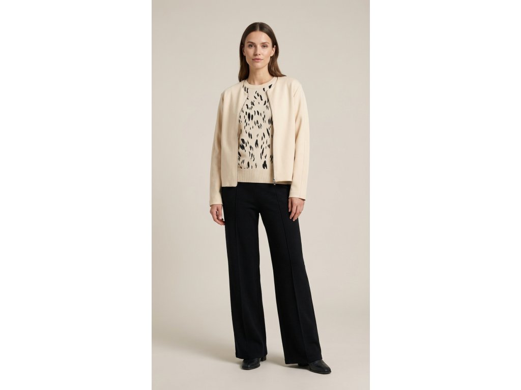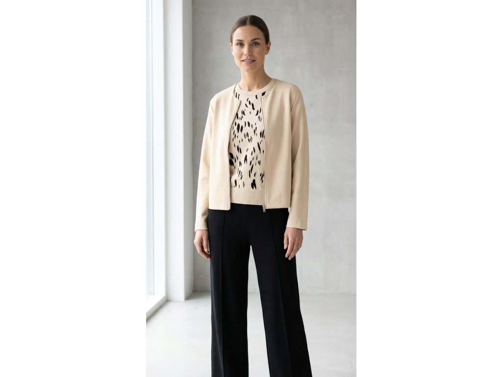 Základom outfitu je náš viskózový sweatjacket v odtieni Sand, ktorý tu plní funkciu ľahkého saka. Jeho čisté línie bez goliera nechávajú vyniknúť vzorovaný úplet pod ním. Svetlý sveter s abstraktným čiernym „animal“ vzorom vizuálne prepája vrchnú časť s tmavým spodkom a dodáva celku dynamiku.