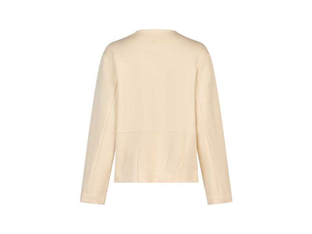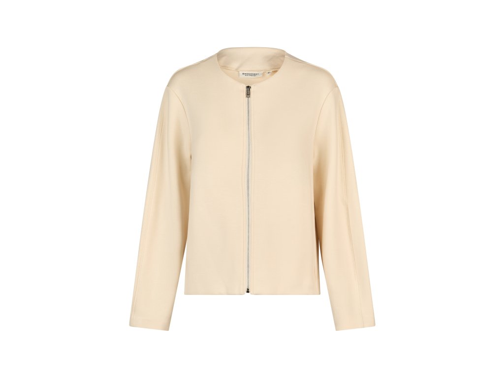 Dominantným prvkom je strieborný kovový zips, ktorý prebieha po celej dĺžke a dodáva kúsku moderný, mestský šmrnc. Neviditeľné všívané vrecká v predných deliacich švoch. Absencia goliera a okrúhly výstrih pôsobia minimalisticky a umožňujú skvele vyniknúť spodnej vrstve alebo šperkom.