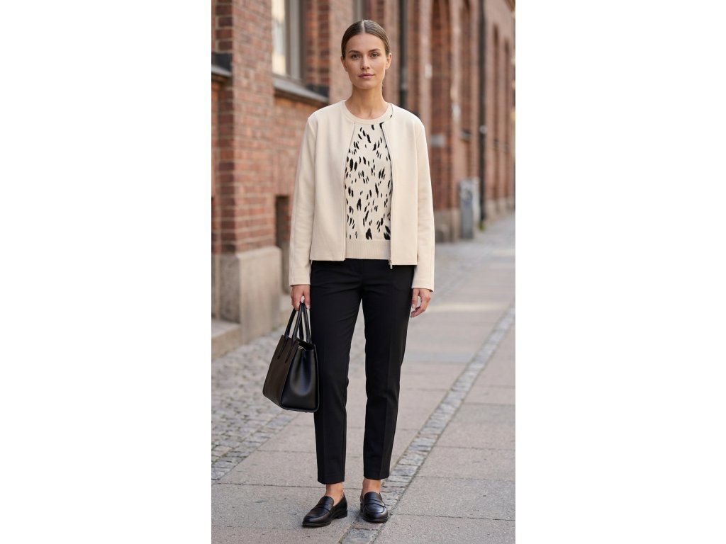 Look dopĺňajú čierne cigaretové nohavice v dĺžke po členky, ktoré krásne predlžujú siluetu. Celok je uzatvorený klasickými čiernymi mokasínami (loafers) a pevnou kabelkou do ruky, čo podčiarkuje mestský, biznisový charakter.