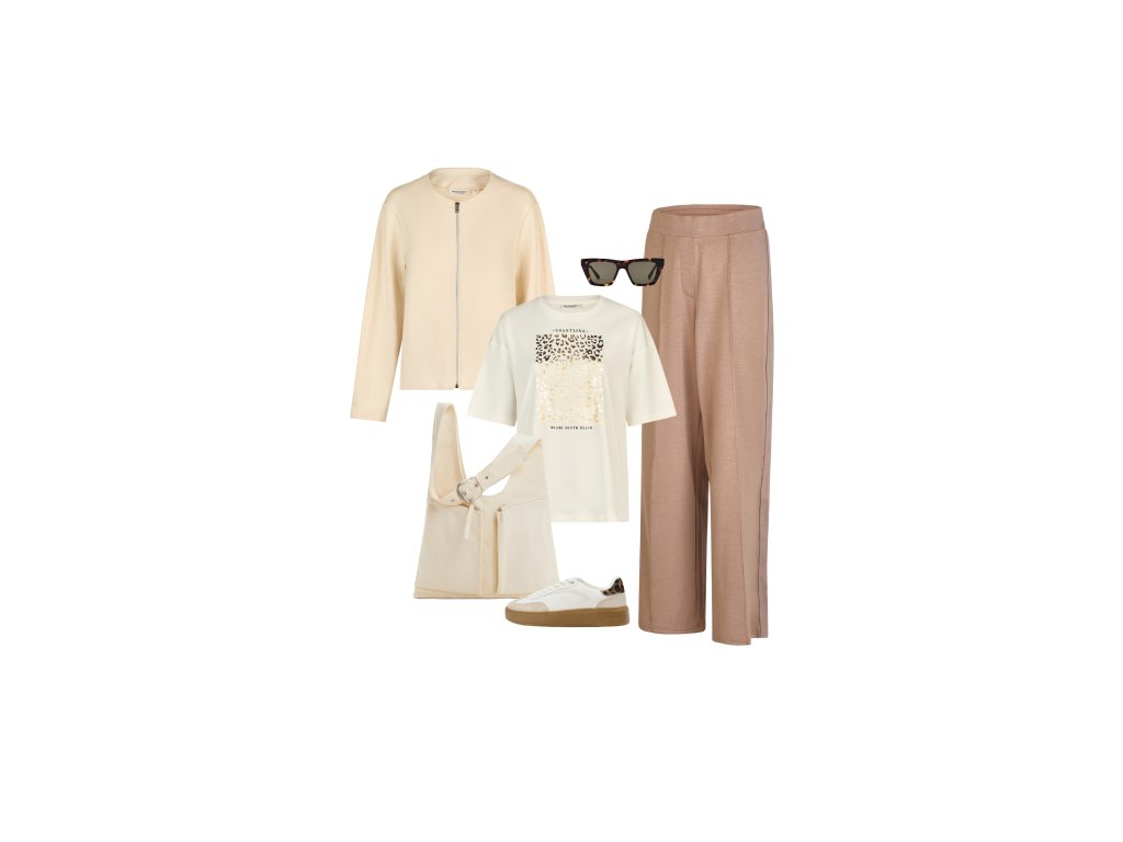 Tento outfit je definíciou moderného „smart casual“ štýlu. Dokonalá súhra jemných pieskových odtieňov a kontrastnej čiernej vytvára look, ktorý pôsobí luxusne, no zároveň je neuveriteľne pohodlný na celodenné nosenie.