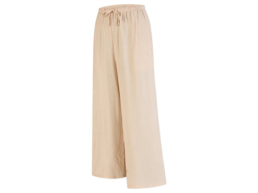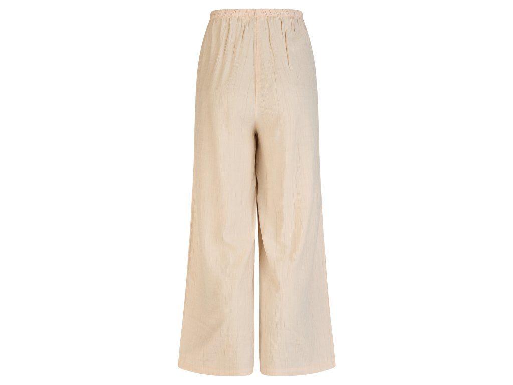 Nohavice majú vyšší sed, ktorý je pohodlný a pekne sedí v páse. Pás je riešený do gumy a doplnený o tunelček so šnúrkou na stiahnutie, čo prináša ešte väčší komfort pri nosení. Praktickým detailom sú dve postranné priehmatové vrecká, zatiaľ čo zadná časť ostáva bez vreciek, takže silueta pôsobí čisto a hladko. Pokrčený vzhľad dodáva nohaviciam moderný charakter a zároveň podčiarkuje ich nenútený letný štýl.