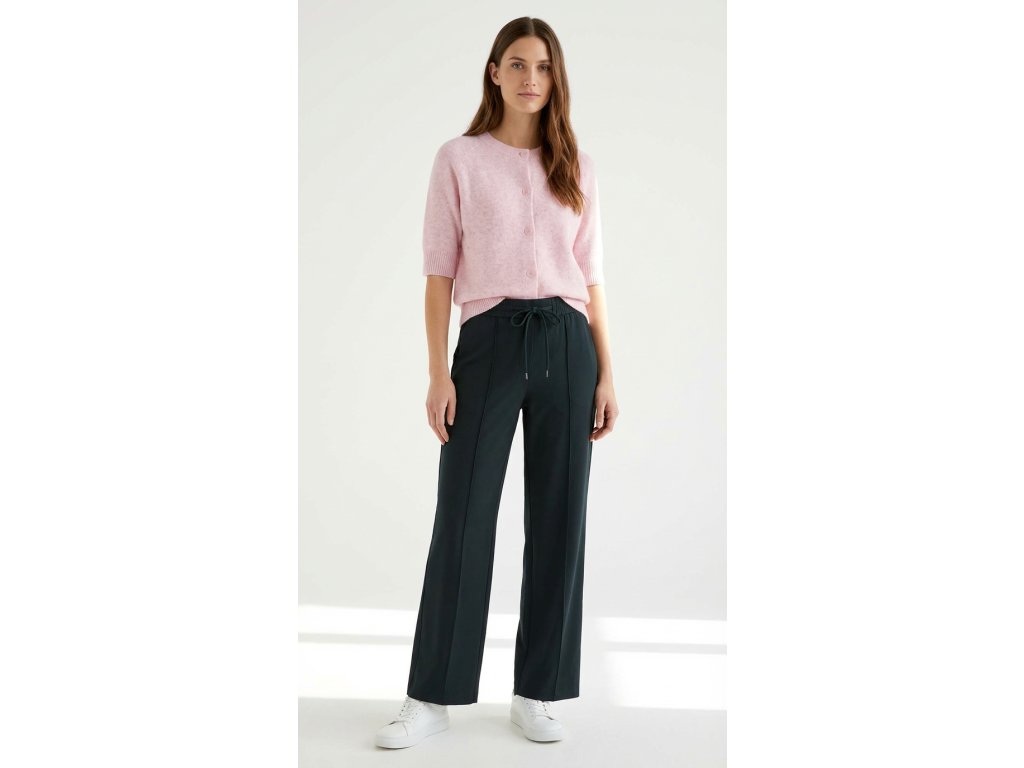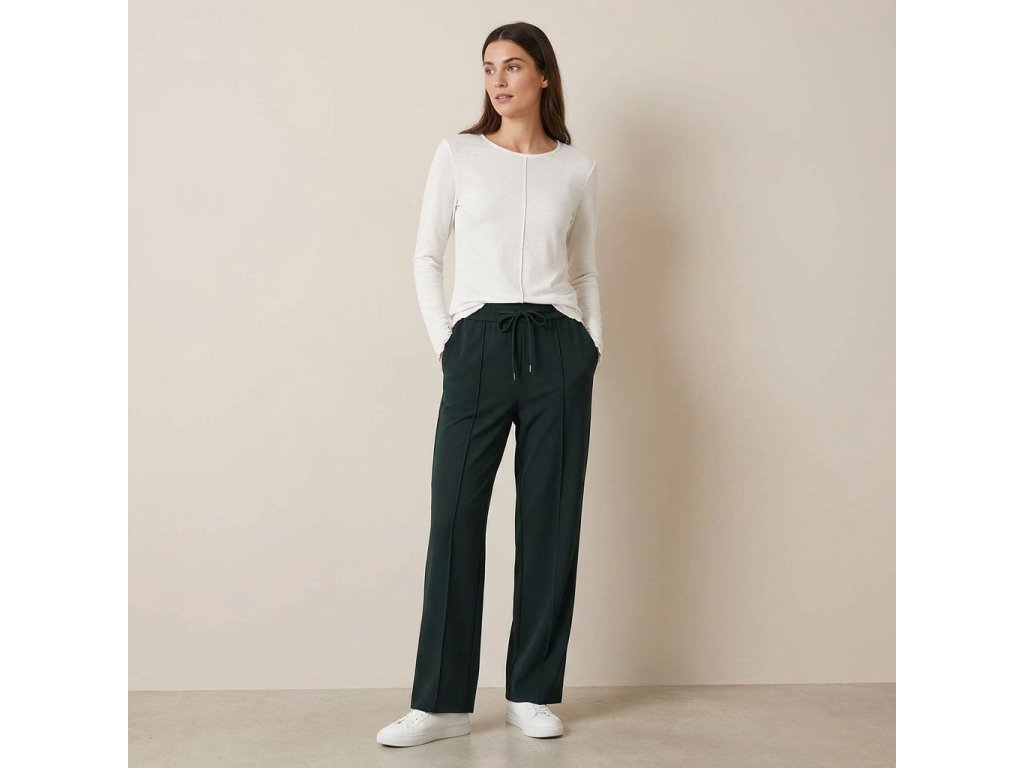 Pohodlie pri nosení zabezpečuje najmä materiál a riešenie pása. Zmes 96 % polyesteru a 4 % elastanu bola zvolená s dôrazom na odolnosť a príjemný pocit na pokožke. Látka je hladká, chladivá a vďaka podielu elastanu sa krásne prispôsobí každému vášmu pohybu bez toho, aby sa nevzhľadne vyťahala na kolenách. Elastický pás so šnúrkou na stiahnutie dodáva nohaviciam športový šmrnc a garantuje, že vás v páse nebude nič tlačiť ani po výdatnom obede. Tieto nohavice sú univerzálnym spoločníkom – obujte si k nim biele tenisky a sveter pre uvoľnený mestský vzhľad, alebo ich skombinujte s lodičkami a blúzkou pre elegantný outfit do kancelárie. Je to kúsok, ktorý sa prispôsobí vášmu dňu, nie vy jemu.