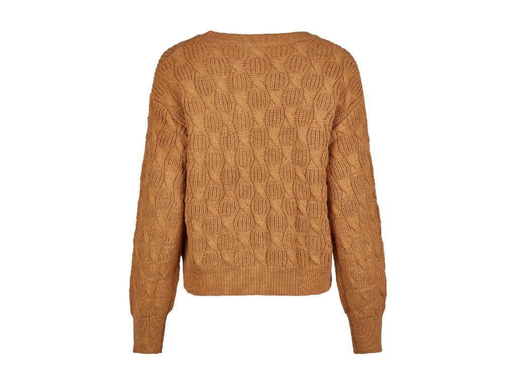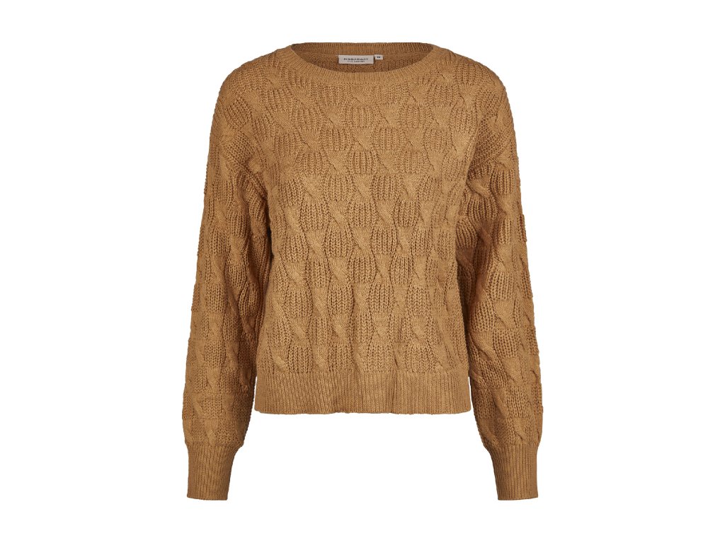 Pletený pulóver BROADWAY NYC FASHION CAMEL BEIGE v karamelovej hnedej farbe. Má okrúhly výstrih, dlhé rukávy a rebrované lemy na rukávoch aj v spodnej časti. Vyznačuje sa plastickým vzorom vytvoreným z opakujúcich sa, mierne skrútených úpletových tvarov, ktoré mu dodávajú výraznú textúru a hrejivý vzhľad. Strih je voľnejší, čo zaručuje pohodlie pri nosení. Celkovo je mäkký, elegantný a vhodný na bežné nosenie počas chladnejších dní.