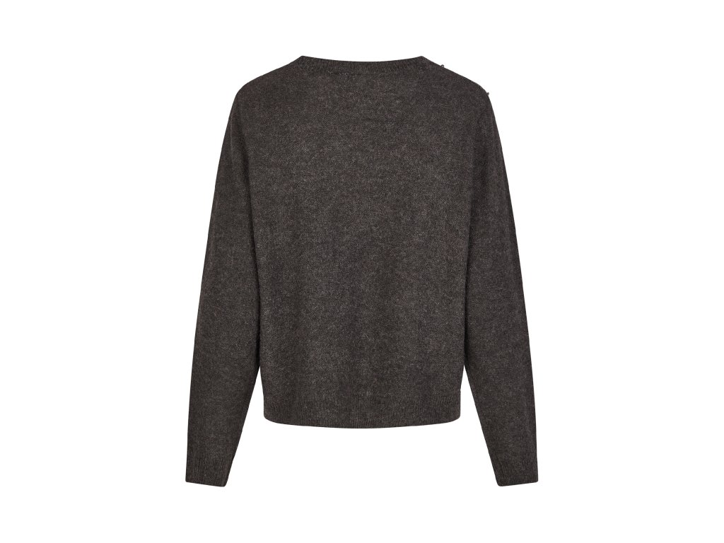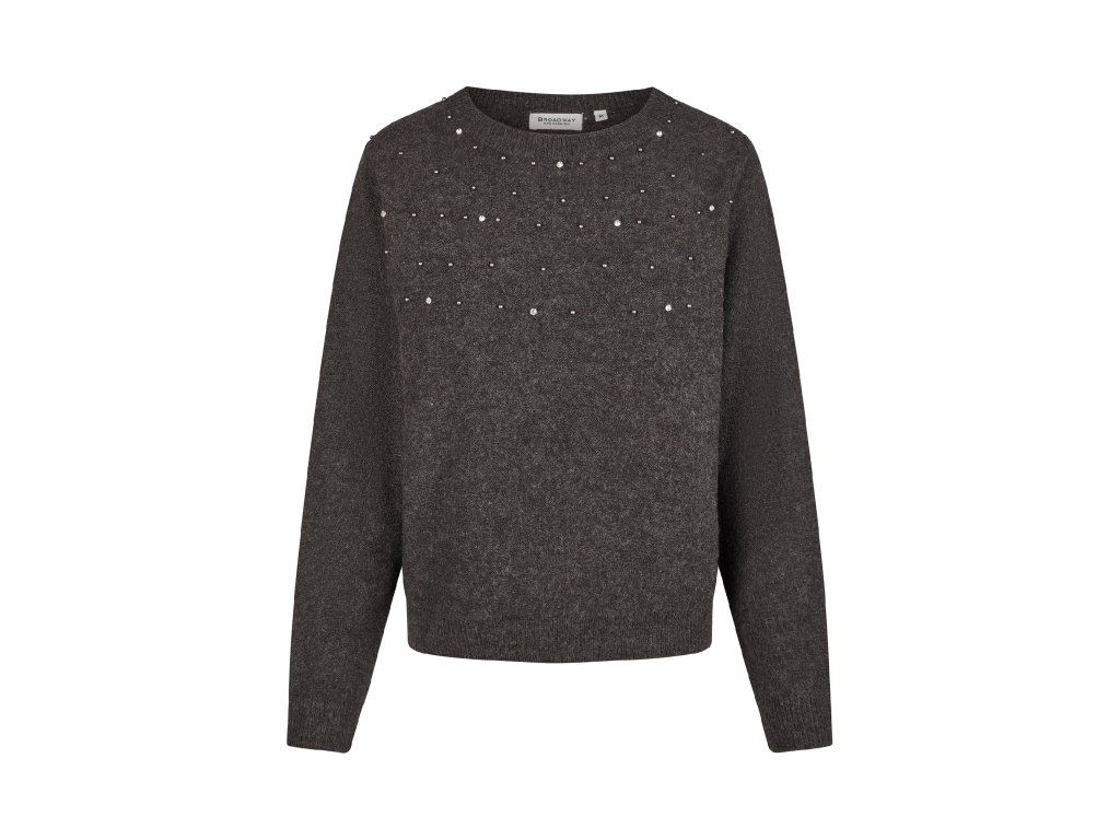 Dámsky tmavosivý sveter s okrúhlym výstrihom a dlhými rukávmi. Horná časť pulóvra je zdobená drobnými perličkami a flitrami, ktoré mu dodávajú elegantný a jemne slávnostný vzhľad. Spodná časť a rukávy majú rebrované lemy, čo zaisťuje lepšie držanie tvaru.