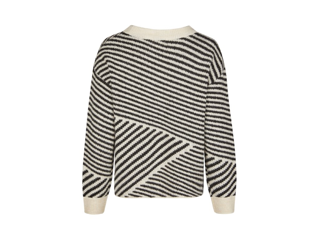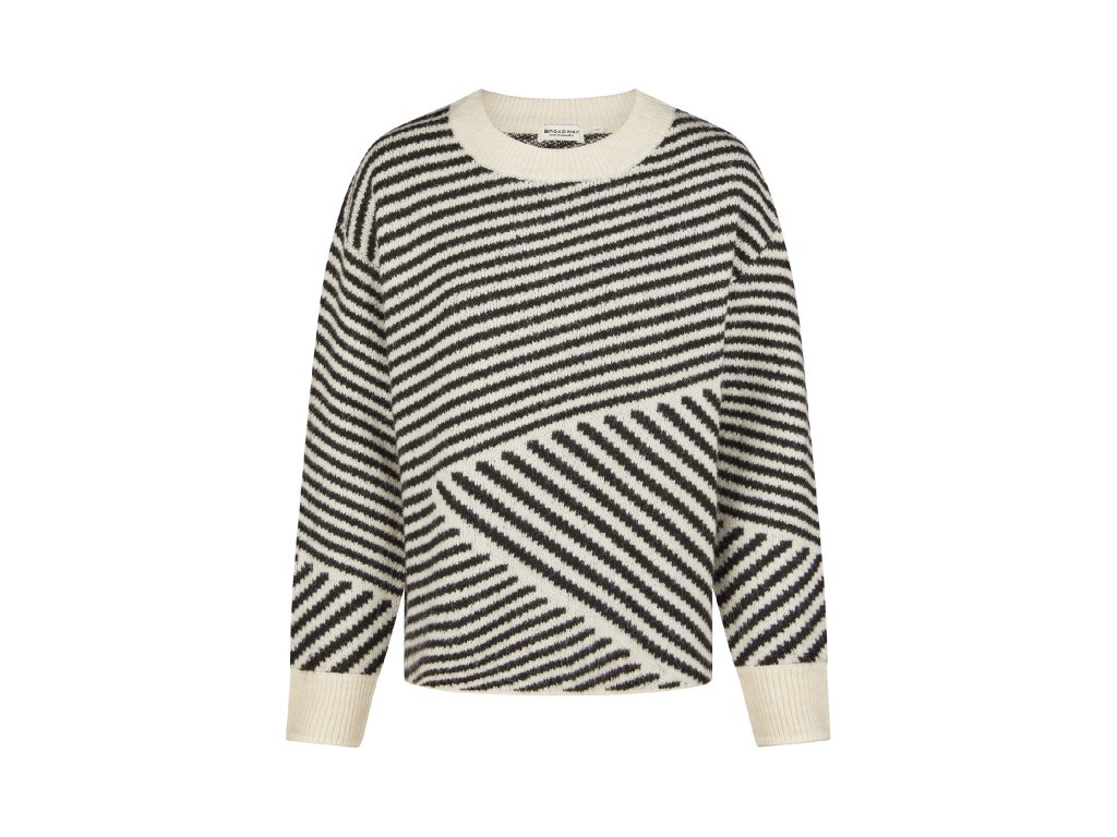 Pulóver BROADWAY NYC FASHION BLACK-CASHEW dámsky pletený hrejivý pulóver s výrazným geometrickým vzorom. Dominujú na ňom čierno-biele diagonálne pruhy, ktoré sa na rôznych častiach pulóvra menia smerom – vytvárajú zaujímavý optický efekt.
