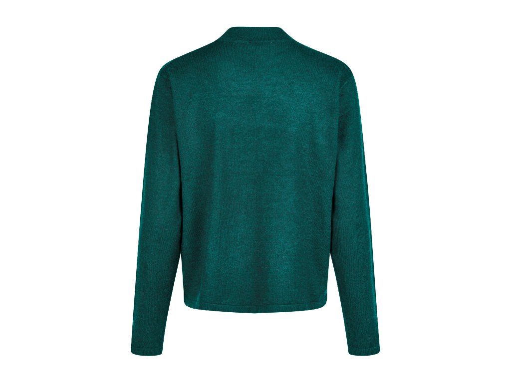 Dámsky pulóver v krásnej smaragdovo zelenej farbe. Má jednoduchý, čistý vzhľad s dlhými rukávmi a stojačikovým golierom, ktorý pôsobí elegantne a moderne.