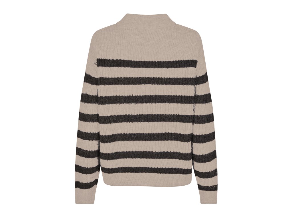 Pruhy sú rovnomerne rozložené po celej časti svetra aj na rukávoch, čo vytvára klasický a nadčasový pruhovaný vzor.