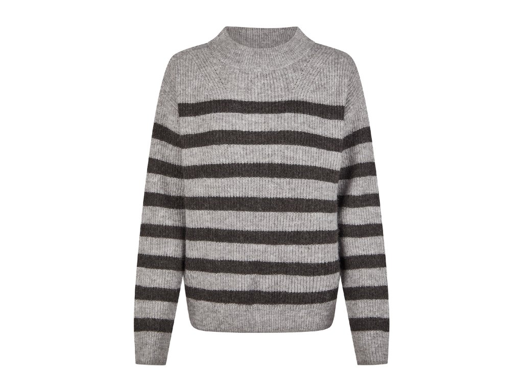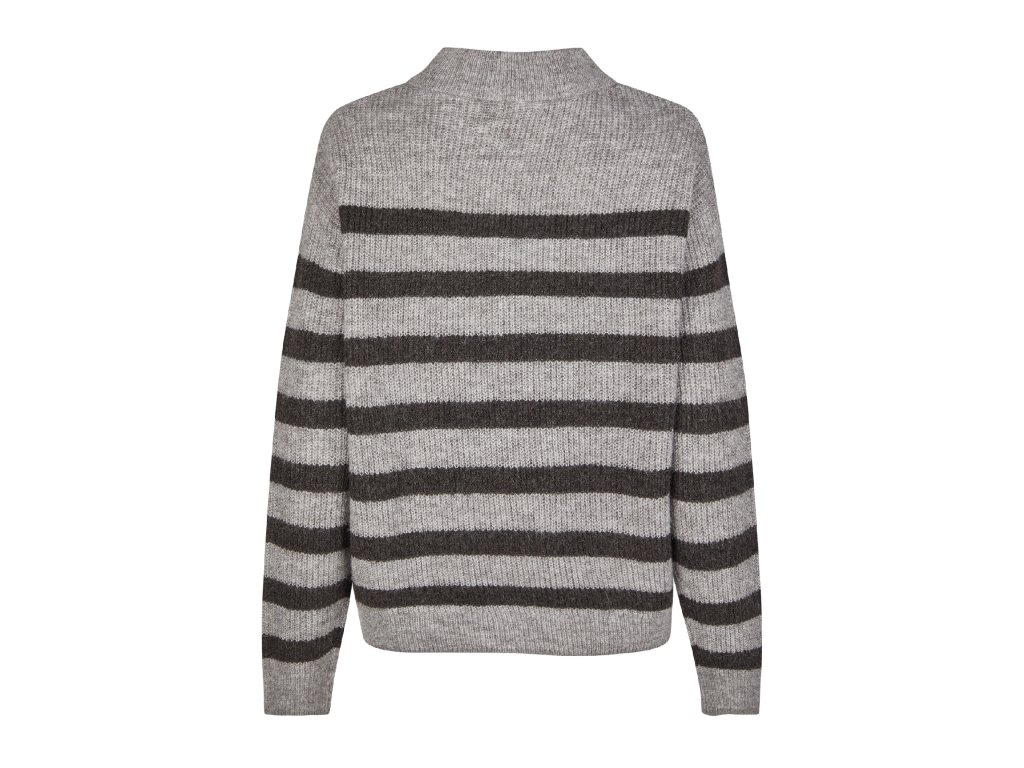 Dámsky pletený sveter v kombinácii svetlosivej a tmavosivej farby so širokými horizontálnymi pruhmi.