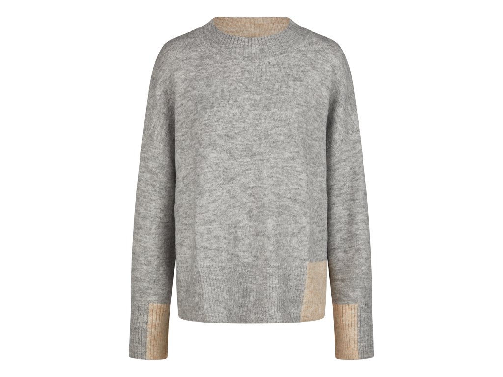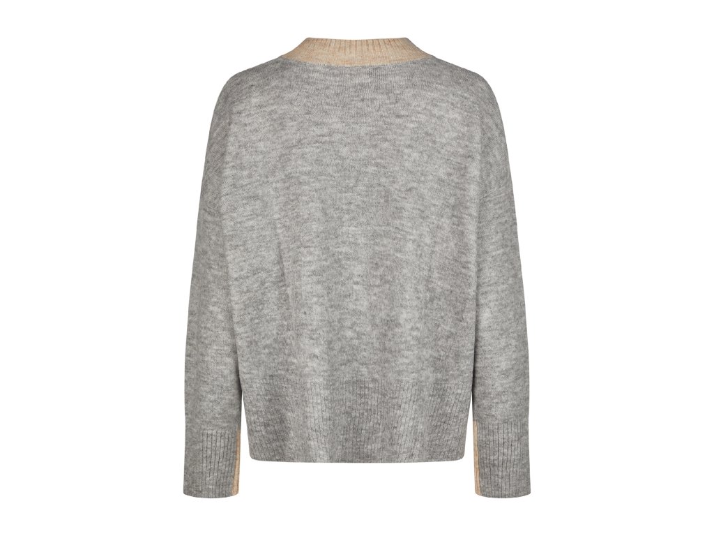 Dámsky pletený sveter v jemnej svetlosivej farbe s decentnými béžovými detailmi.