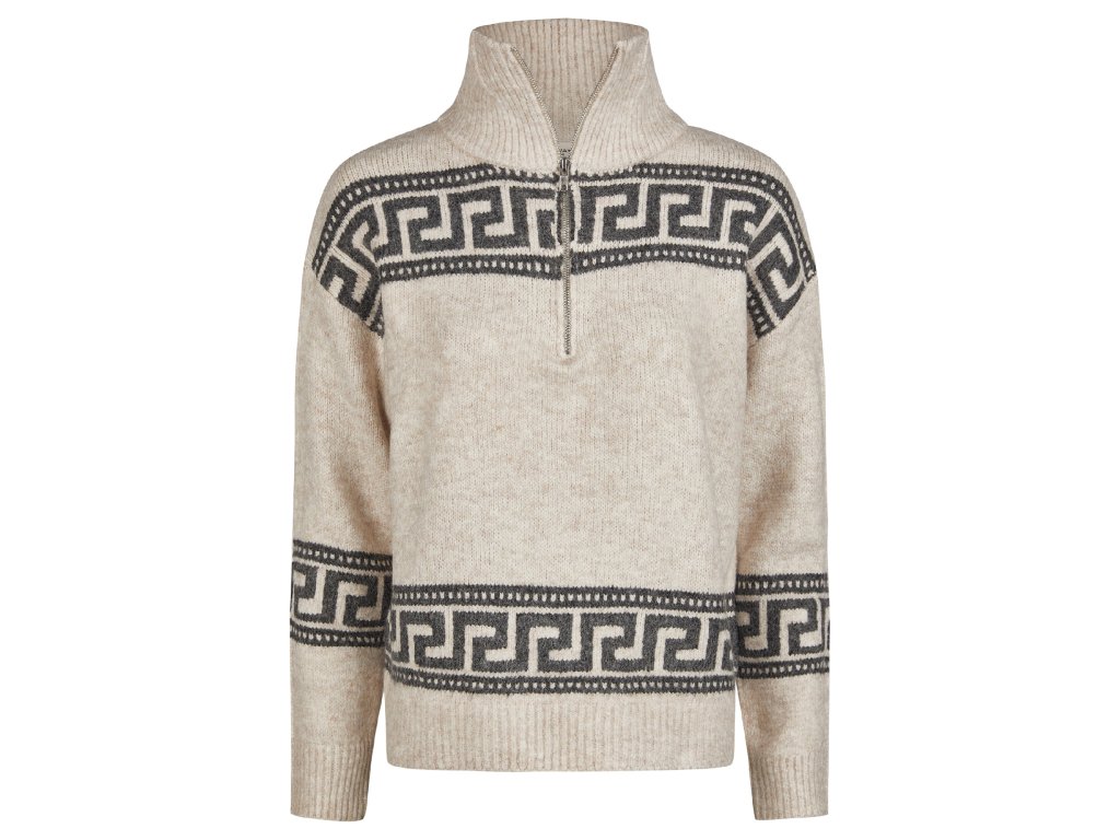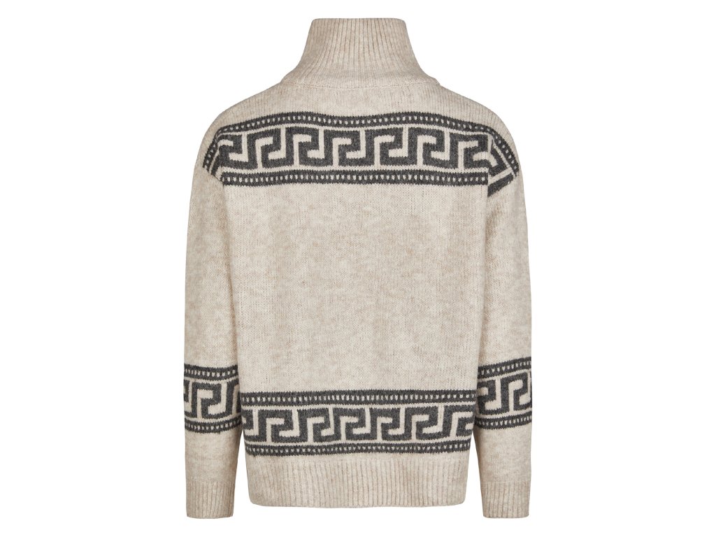 Dámsky pletený sveter v béžovej farbe s výrazným tmavosivým geometrickým vzorom v štýle gréckeho motívu (meander) na hrudi, rukávoch a spodnom leme.