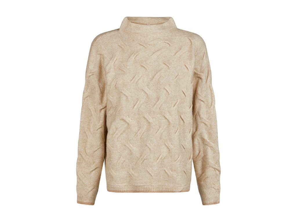 Sveter má voľný, pohodlný strih, dlhé rukávy a jemne stojačikový golier, ktorý pôsobí elegantne a zároveň chráni krk pred chladom.