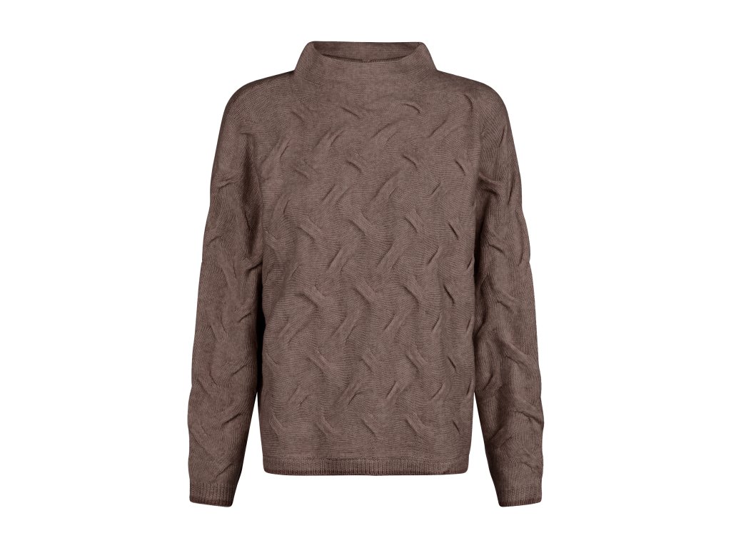 Dámsky pletený štýlový a hrejivý pulóver s výraznou plastickou štruktúrou v hnedastej teplej farbe v podobe jemne skrúteného vzoru čo mu dodáva originálny a moderný vzhľad.
