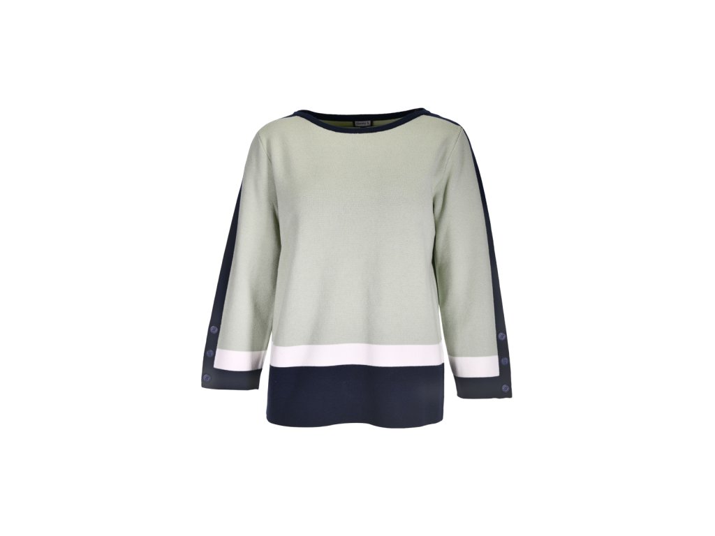 - Útulný sveter v jemnej šalviovej zelenej v kombinácii s tmavomodrou a smotanovou