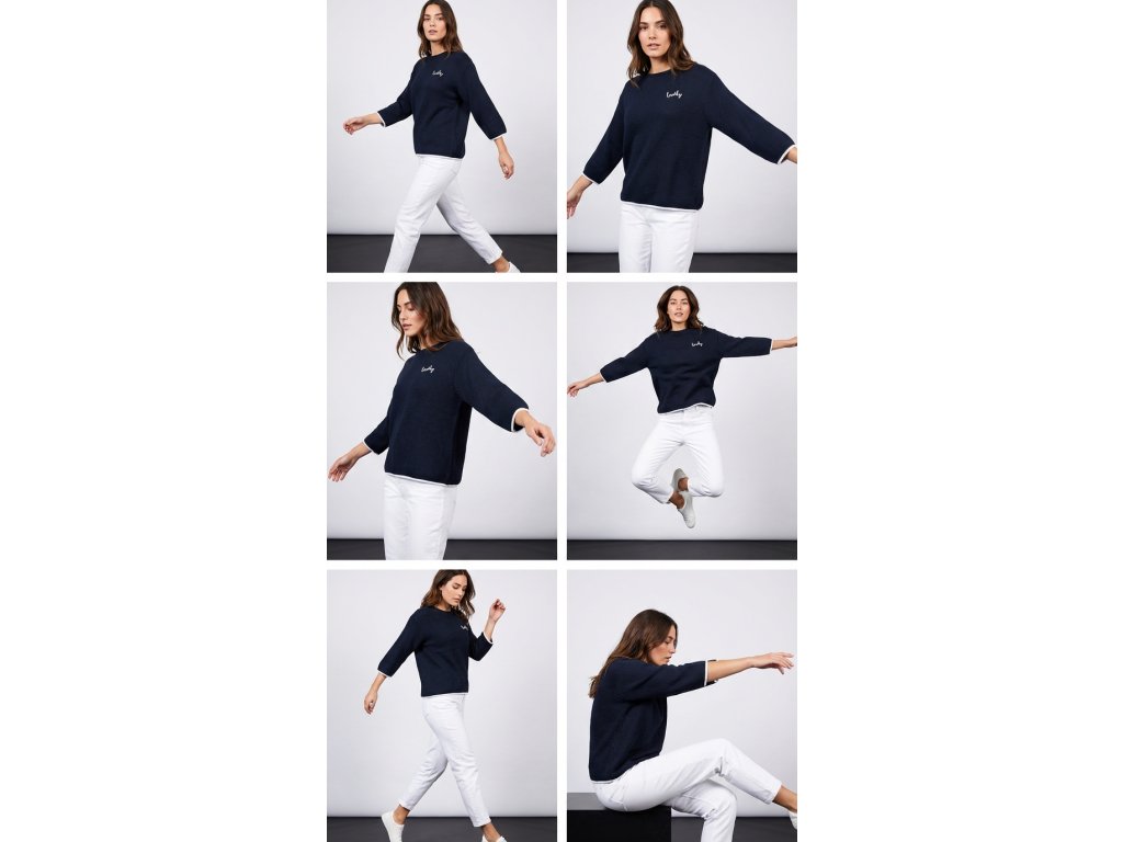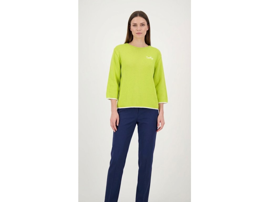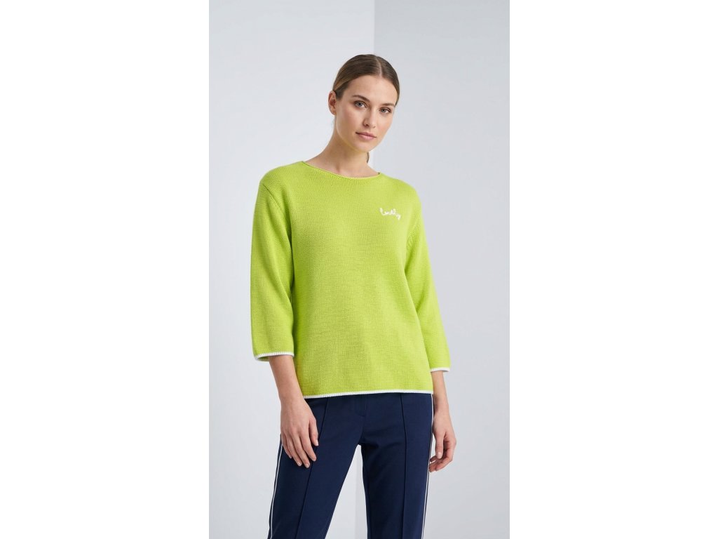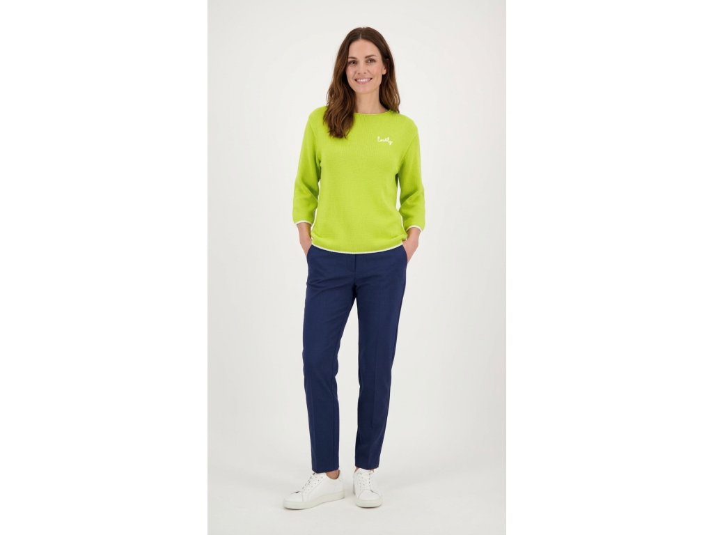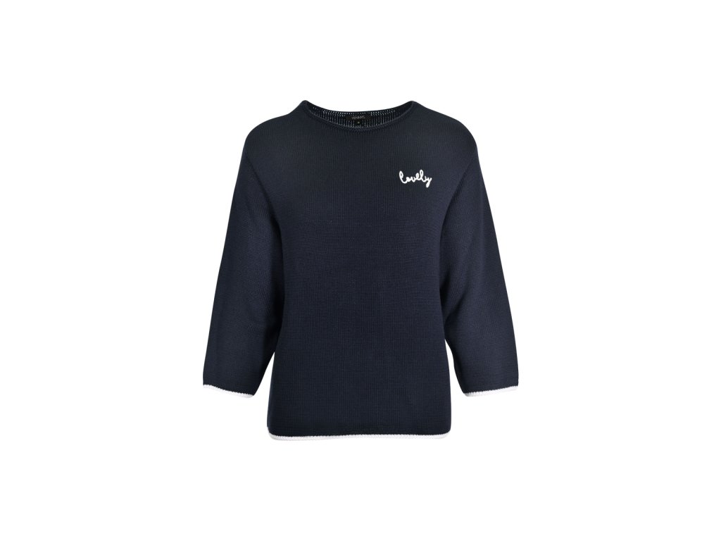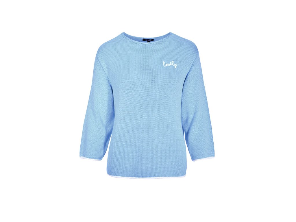 Dámsky pletený sveter s jednoduchým rovným strihom a okrúhlym výstrihom. Má 3/4 rukávy a jemnú, príjemnú štruktúru úpletu. Na hrudi je malá kontrastná výšivka s nápisom „lovely“, ktorá dodáva svetru ženský detail. Lemovanie rukávov a spodného okraja je jemne kontrastné. Model je dostupný v troch farebných prevedeniach: tmavomodrá, svetlomodrá a limetkovo zelená.