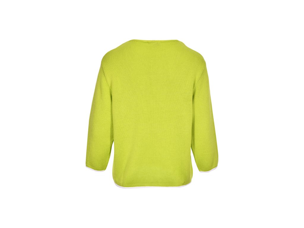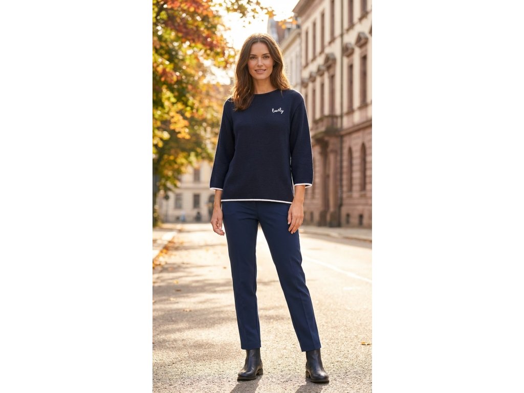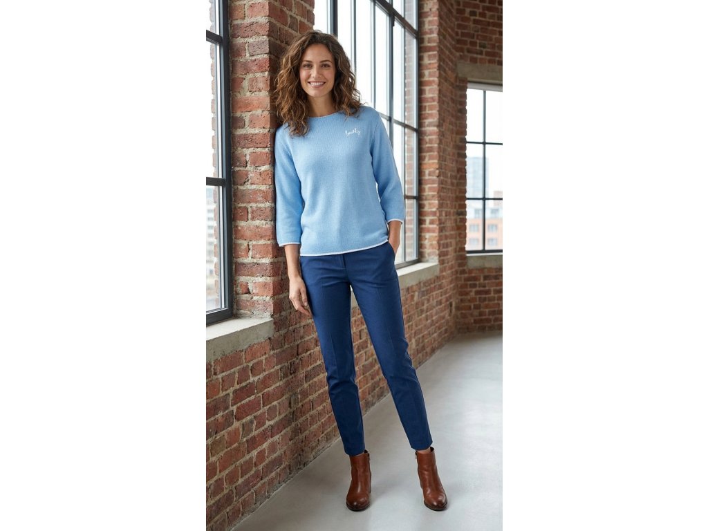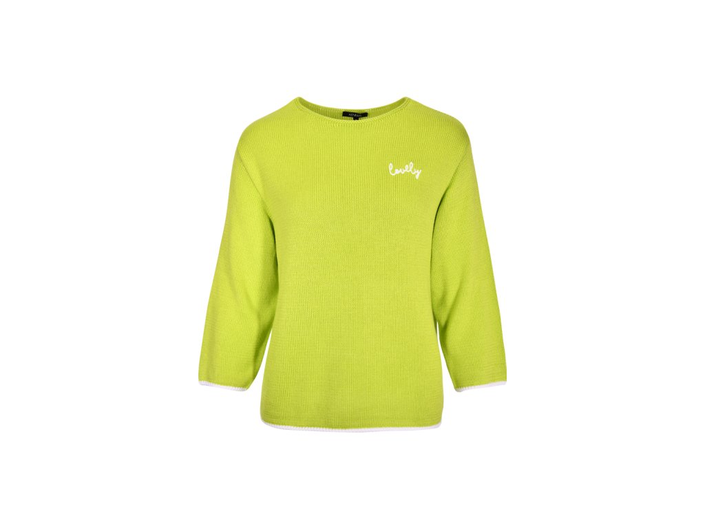 Dámsky pletený sveter s jednoduchým rovným strihom a okrúhlym výstrihom. Má 3/4 rukávy a jemnú, príjemnú štruktúru úpletu. Na hrudi je malá kontrastná výšivka s nápisom „lovely“, ktorá dodáva svetru ženský detail. Lemovanie rukávov a spodného okraja je jemne kontrastné. Model je dostupný v troch farebných prevedeniach: tmavomodrá, svetlomodrá a limetkovo zelená.