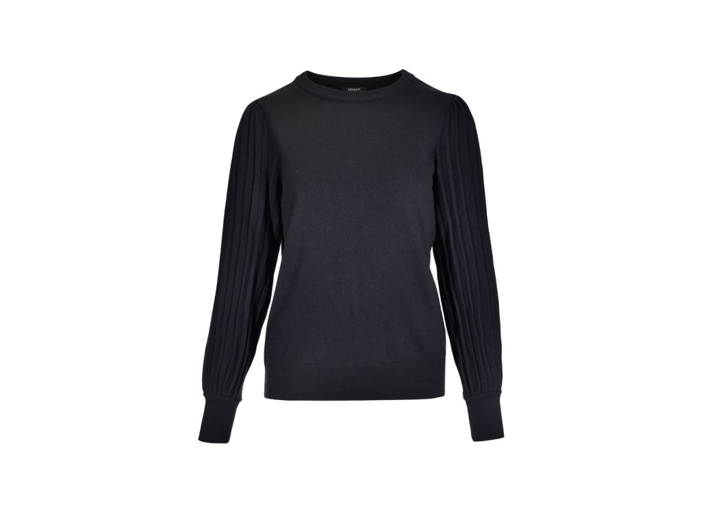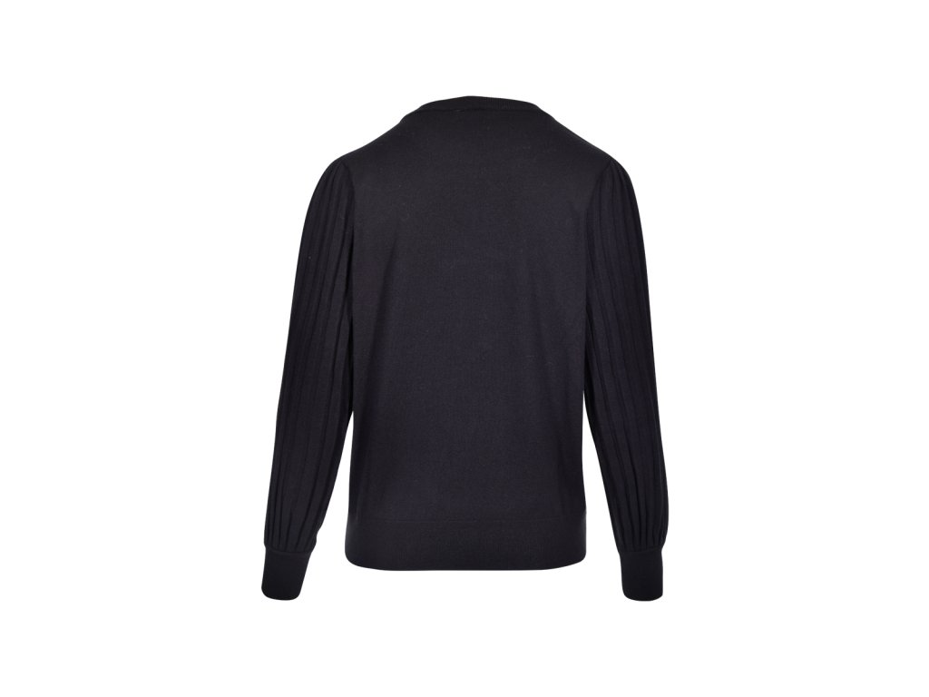 Štýlový pulóver, ktorý spája jednoduchosť s eleganciou. Predná aj zadná časť sú čisté a minimalistické, zatiaľ čo plisované rukávy dodávajú modelu výnimočný charakter. Materiál je príjemne mäkký, hrejivý a komfortný na celodenné nosenie.