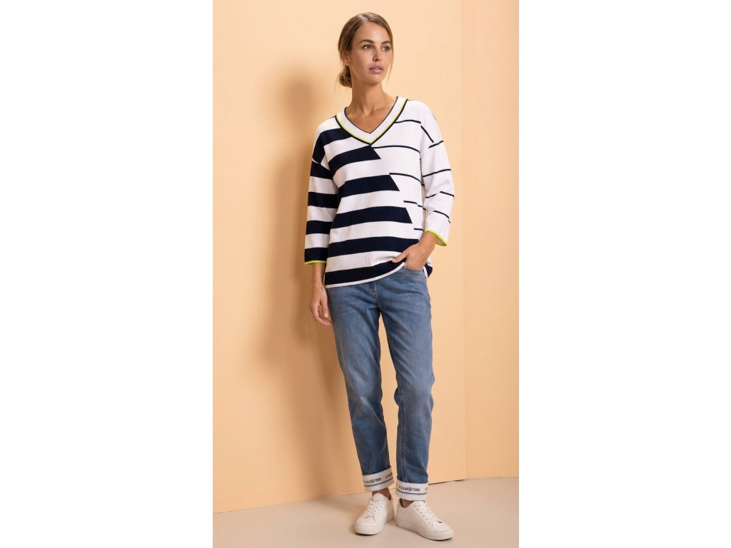 Dámsky pulóver KENNYS. v prevedení STRIPE INDIGO s výrazným pruhovaným vzorom. Pulóver má voľnejší, pohodlný strih so spadnutým ramenom a 3/4 (7/8) rukávmi. Dominantou je V‑výstrih s kontrastným lemovaním (tmavomodrá/indigo s tenkým neonovo‑žltým akcentom), ktorý mu dodáva športovo‑elegantný vzhľad.