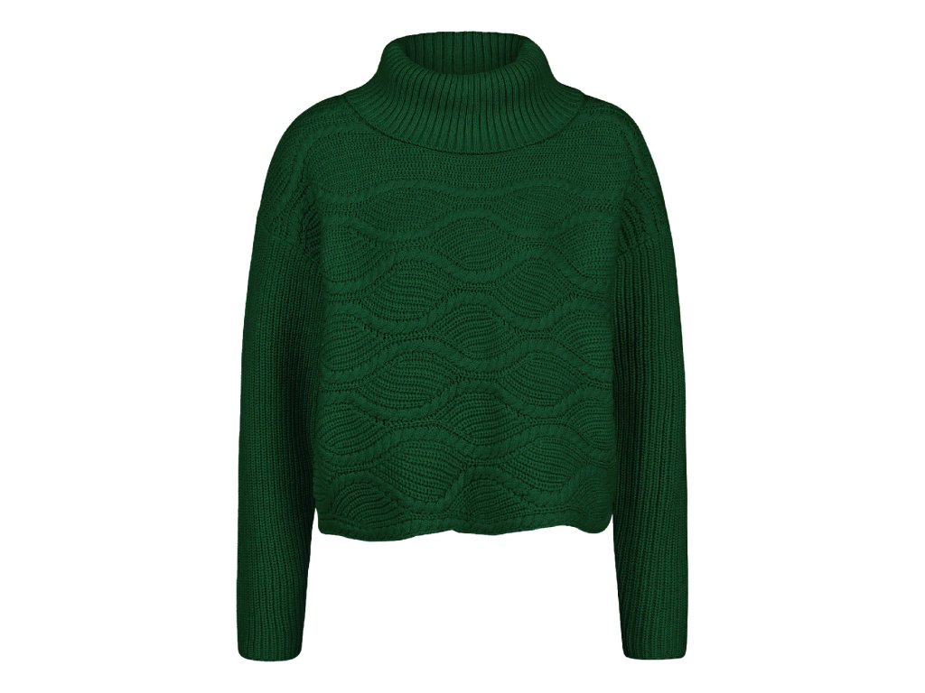 Dámsky pletený rolák v krásnej tmavozelenej farbe s výrazným plastickým vzorom vlnoviek po celej prednej a zadnej časti.