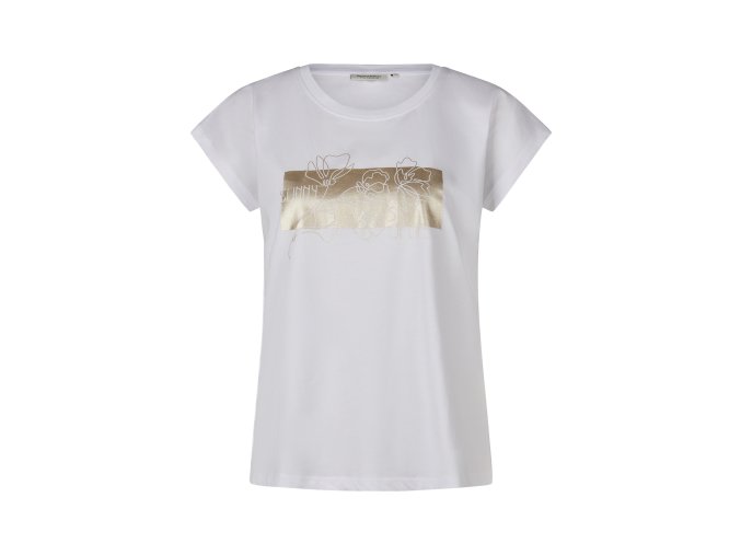 Tričko BROADWAY NYC FASHION "SUNNY SIDE OF LIFE" WHITE. Dekoratívna potlač na prednej strane: zlatistý obdĺžnik s jemnou líniovou kresbou kvetov a nápisom "SUNNY SIDE OF LIFE". - Obrazne to vyjadruje pozitívny pohľad na život — zamerajte sa na radostné, šťastné a svetlé chvíle.