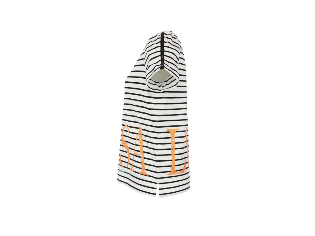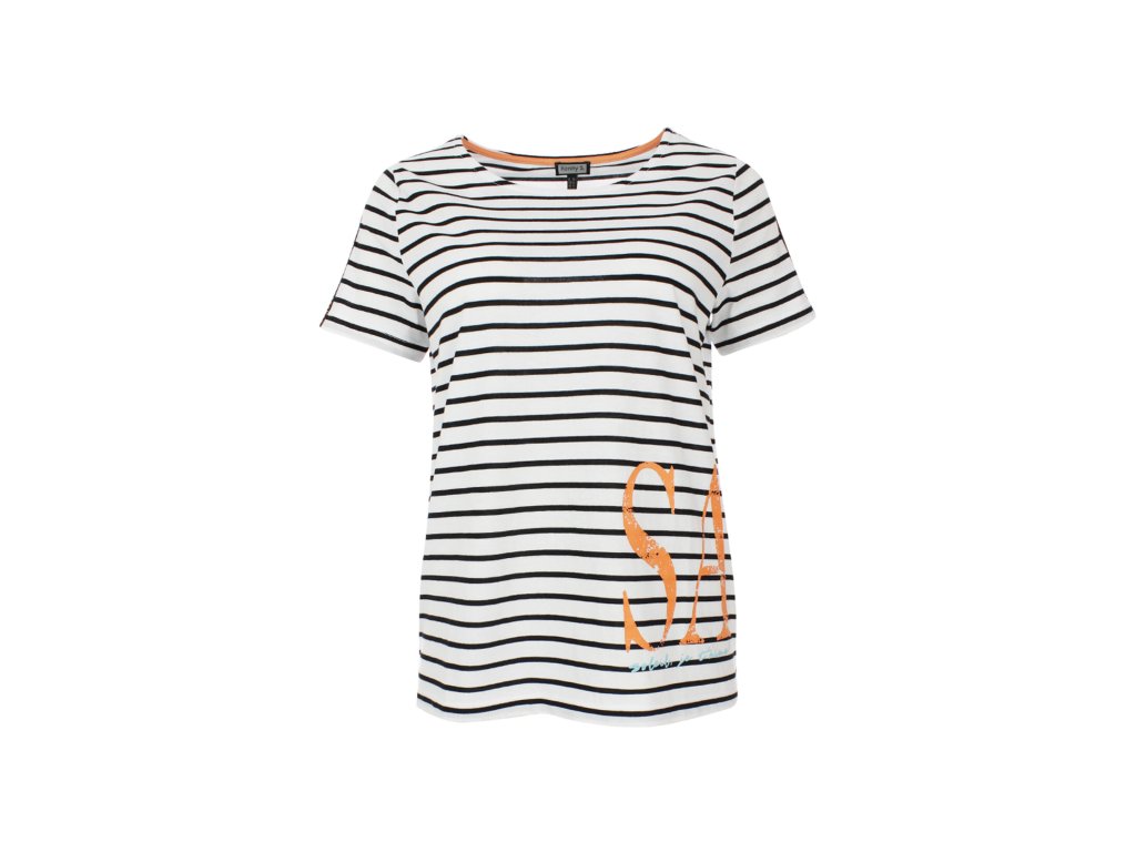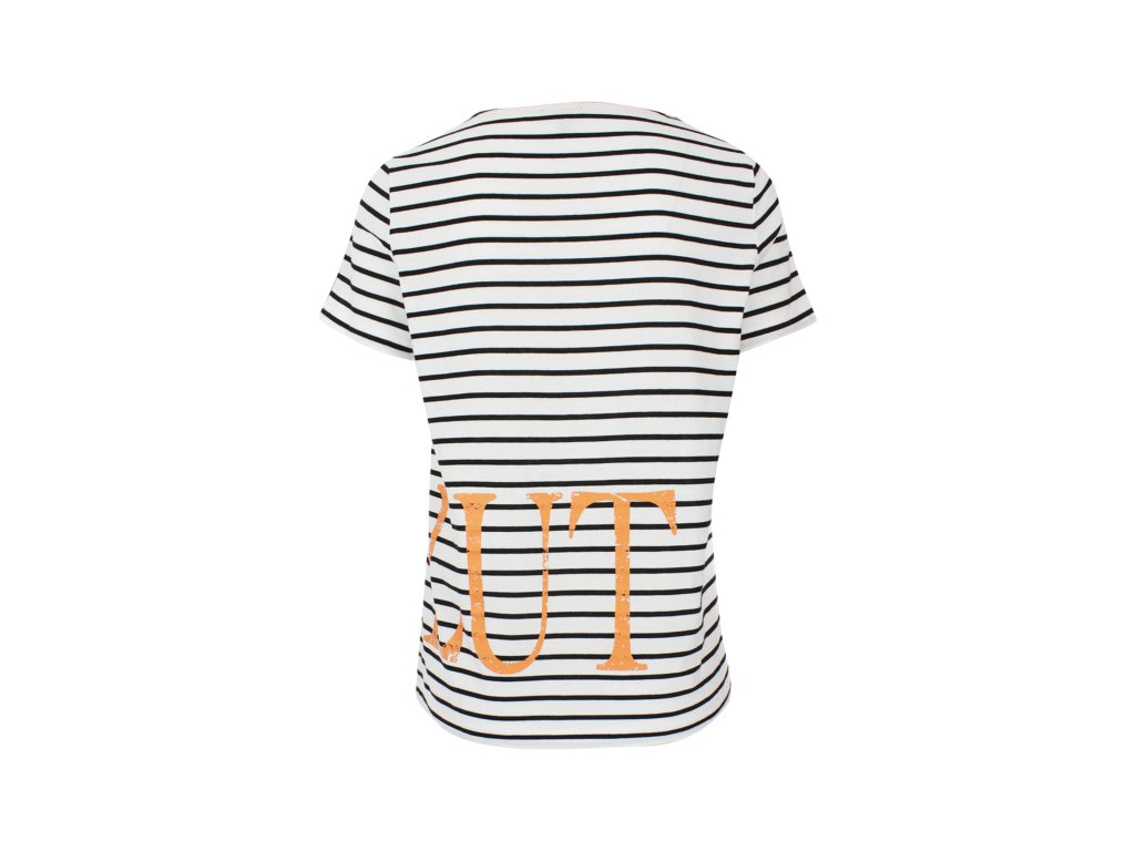 - Prúžkované tričko voľného strihu s textovou kontrastnou oranžovou potlačou "SALUT"