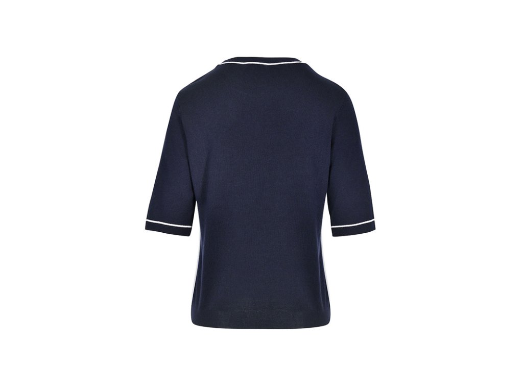 Dámske tričko s krátkym rukávom v tmavomodrej (indigo) a bielej farbe. Tričko má okrúhly výstrih, rovný, mierne voľnejší, ale nie široký strih a krátke rukávy s dĺžkou po lakeť. Spodný okraj je jemne stiahnutý do lemu s gumičkou, vďaka čomu tričko pekne drží tvar. Na prednej strane sa nachádza nenápadná pogumovaná potlač srdca v oblasti hrudníka. Materiál je mäkký, príjemný na dotyk a priedušný. Kombinácia bavlny a modalu zabezpečuje pohodlie počas celého dňa, zatiaľ čo elastan dodáva pružnosť a lepšie prispôsobenie postave.
